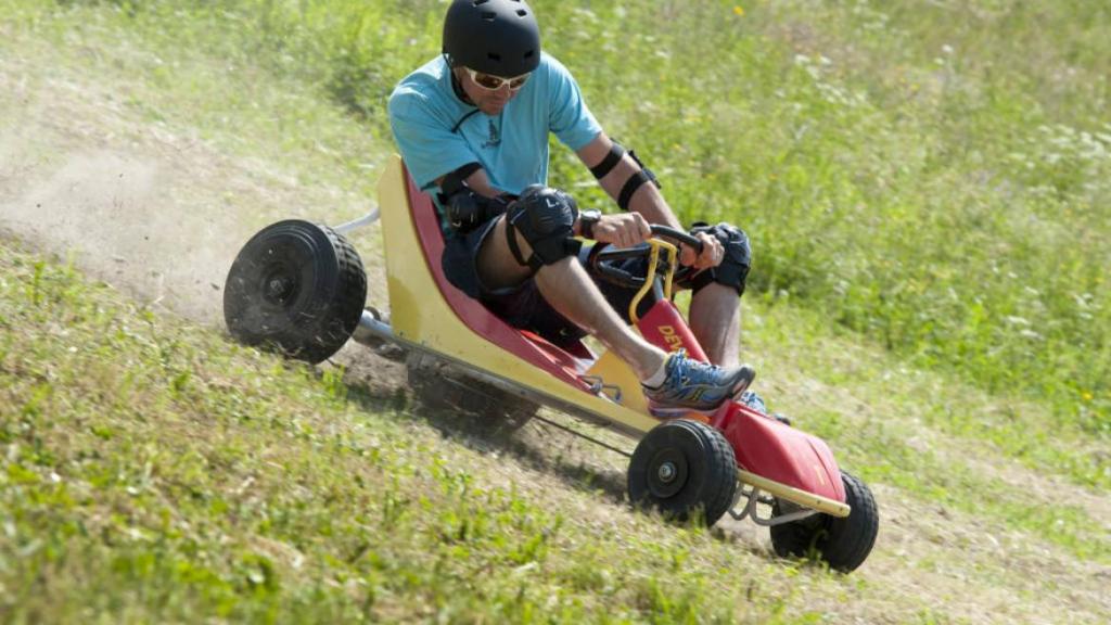 Profitez des sensations de descente avec ce kart sans moteur, avec frein au volant, pour dévaler les pentes en toute sécurité. Il s’accroche à une perche de téléski pour remonter sans effort!